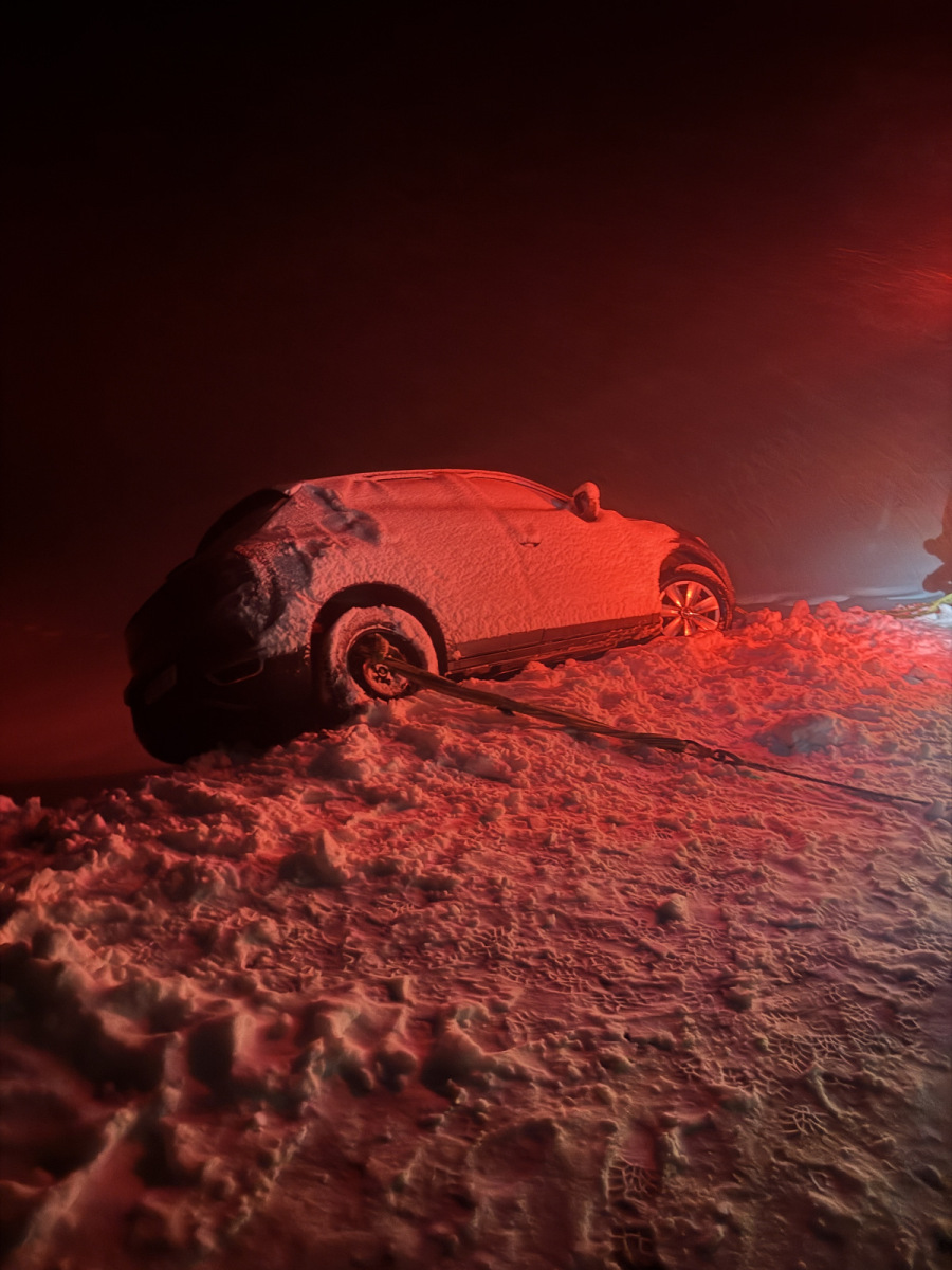Aufgrund der schneebedeckten Fahrbahn ist ein PKW über den Straßenrand gerutscht.
