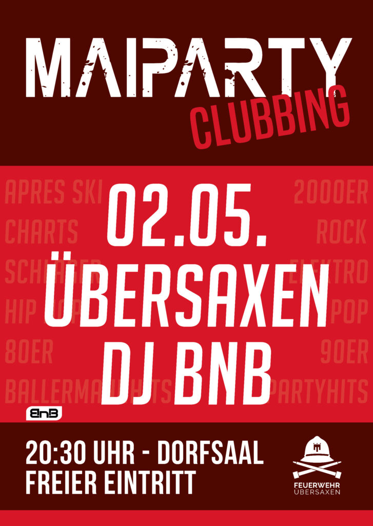 Am Samstag, den 02. Mai 2026 findet wieder die legendäre Maiparty im Dorfsaal Übersaxen statt.